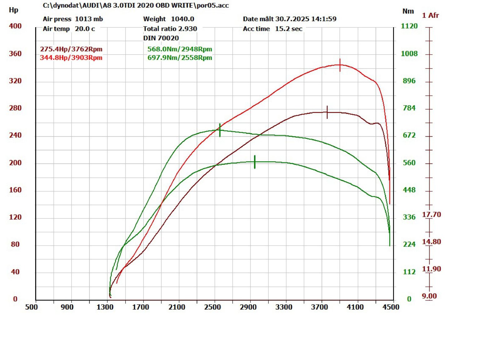 Wykonaliśmy profesjonalną modyfikację Audi A8 D5 3.0 TDI z 2020 roku w naszym serwisie w Koszalinie. Moc nominalna wzrosła z 275 KM do 344 KM, a moment obrotowy z 568 Nm do 697 Nm. Efekt? Wyraźnie lepsza dynamika, szybsze przyspieszenie i większa elastyczność silnika w całym zakresie obrotów.